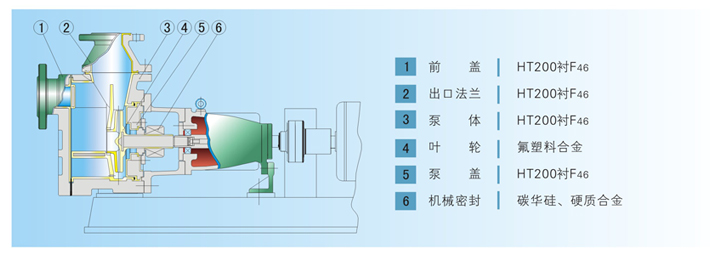 過(guò)流部件采用氟塑料、氟塑料合金制造,耐腐蝕性能優(yōu)異?;w采用金屬制造,耐壓能力強(qiáng)。